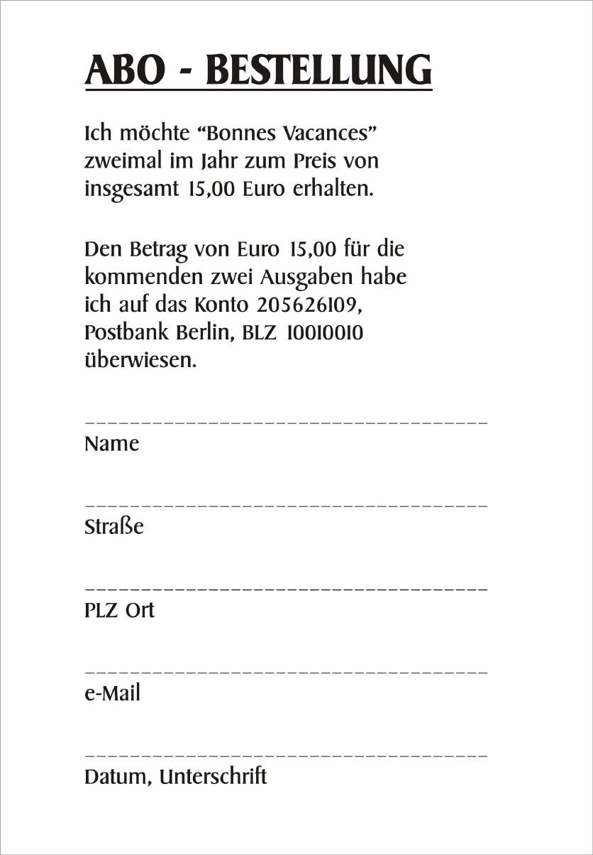 Den Betrag von Euro 15,00 für die kommenden zwei Ausgaben habe ich auf das Konto: 205626109, Postbank Berlin, BLZ 10010010 überwiesen.