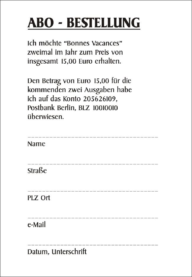 Ich möchte die Printausgabe von "Bonnes Vacances" zweimal im Jahr zum Preis von insgesamt 15,00 Euro erhalten.