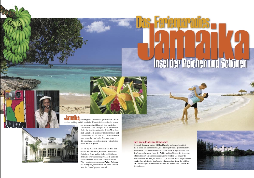 Jamaika, die drittgrößte Karibikinsel, gehört zu den Großen Antillen und liegt südlich von Kuba. Über die Hälfte des Landes besteht aus tropischen Urwäldern mit einer exotischen Pflanzenwelt sowie Gebirgen, wobei die höchsten Gipfel der Blue Mountains über 2.000 Meter hoch sind. Dazu locken herrlich weiße Sandstrände und die Temperaturen von ca. 28 – 32° C, bei denen der Passatwind immer für eine leichte Brise sorgt, garantieren, daß Jamaika mit zu einer der verlockendsten Feriendestination der Welt gehört.