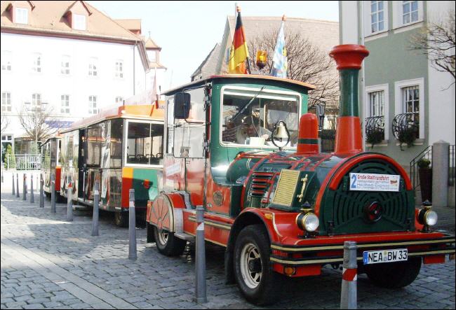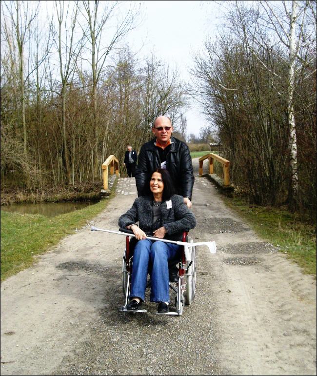 Geschäftsführer der Franken-Therme, Siegfried Heger, sorgte dafür, dass die am Bein verletzte Sigrun Lüddecke, auf vier Rädern an der Besichtigungsrunde im Freilandmuseum teilnehmen konnte.